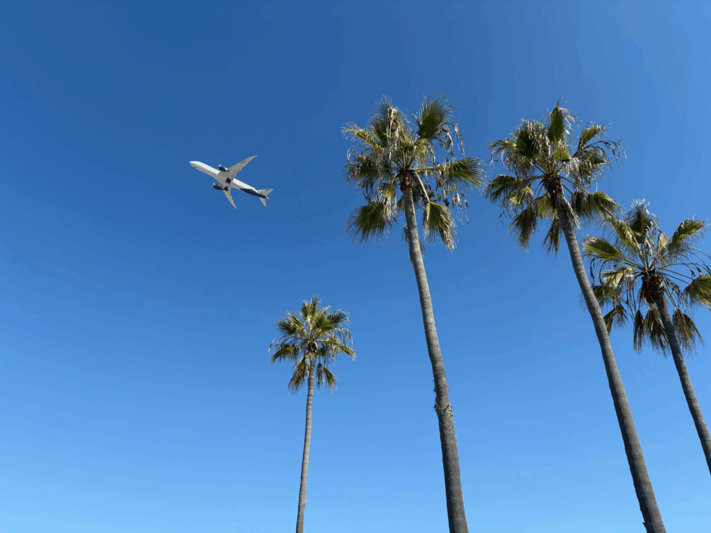 Heureusement, à la sortie de l’aéroport, la Californie nous accueille avec son soleil blanc et ses palmiers clichés — et cette odeur de kérosène qui fait office de parfum d’ambiance à LAX. On embarque dans un bus direction Hermosa Beach, sans un seul dollar en poche (génie de l’organisation, épisode 1).
