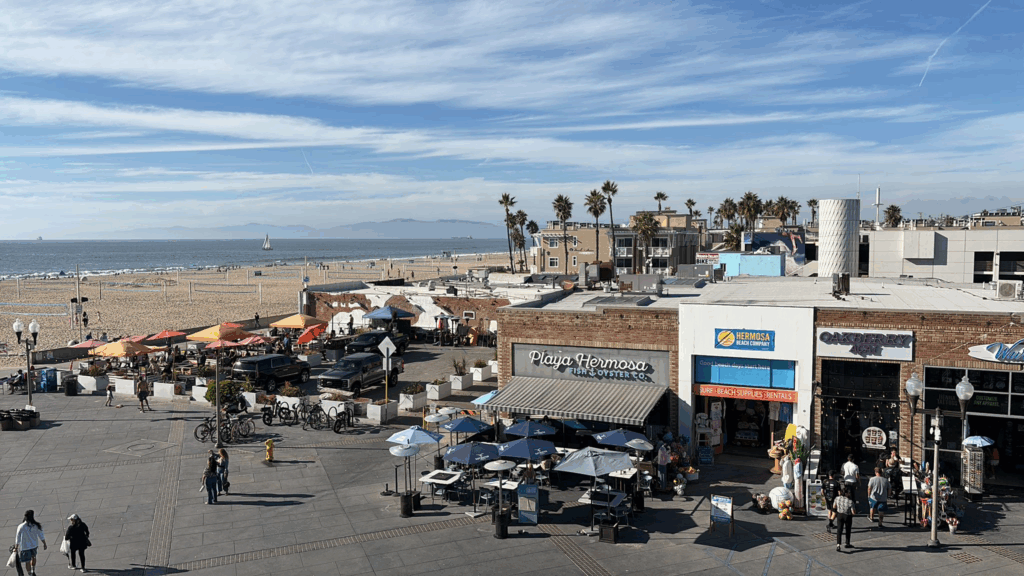Hermosa, c’est un village californien en bord d’océan, avec des joggeurs à 6h du matin, des petits cafés qui sentent le granola et le sable fin, et une jetée où le Pacifique s’écrase comme dans un film. On pose les sacs, on avale une bière face à la mer, et on se force à tenir jusqu’à 19h30 avant de sombrer. Objectif : battre le décalage horaire.