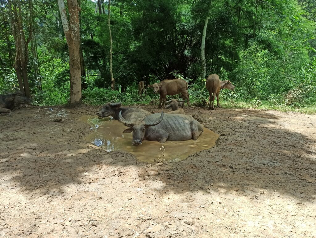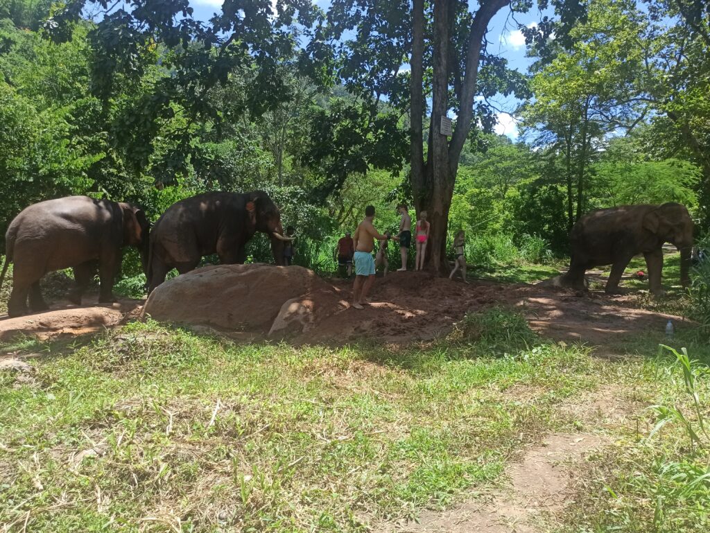 Au bout d’une heure et demi deux heures on arrive à un village et on mange un pad thaï, végétarien. Ventre plein, on reprend la route et on commence à se faire des au revoir timides. La journée n’est pas finie mais elle a déjà un goût de » fin d’un monde ». On ira voir les éléphants, de manière plus que rapide. On est contents d’avoir réservé une journée dans une réserve car ce qu’on nous propose là n’est qu’une introduction. On ira ensuite voir des papillons dans une volière. Chouette spectacle, la fameuse surprise promise à midi.